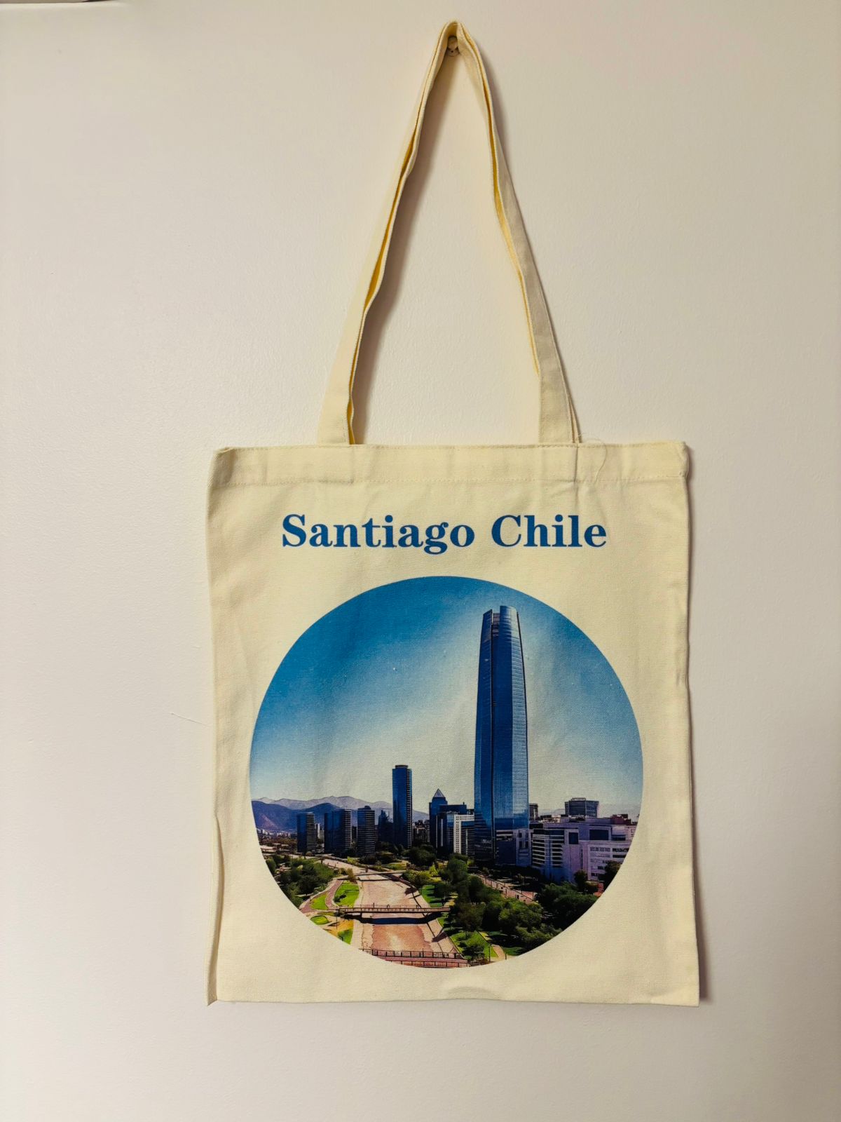 Bolsa de crea , estampada con imagen característica de Santiago.